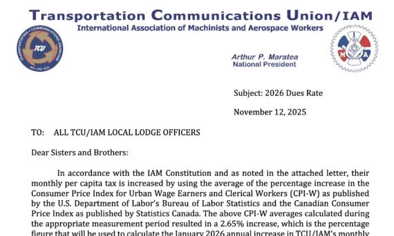 In accordance with the IAM Constitution and as noted in the attached letter, their monthly per capita tax is increased by using the average of the percentage increase in the Consumer Price Index for Urban Wage Earners and Clerical Workers (CPI-W) as published by the U.S. Department of Labor’s Bureau of Labor Statistics and the