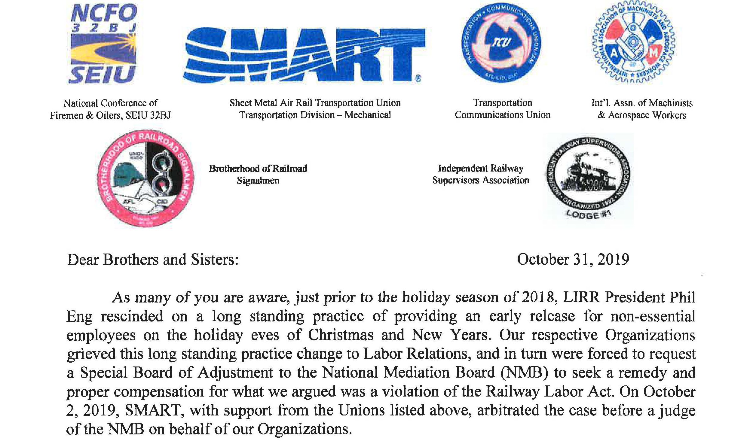 Just before the 2018 holiday season, LIRR revoked its long standing practice of allowing early release for all non-essential employees on Christmas Eve and New Year’s Eve. TCU & IAM, along with SMART-TD, NCFO, IRSA, and BRS all grieved this issue. SMART TD brought the case before an arbitrator, who has just ruled in favor of the union. All of the unions who grieved this issue will benefit from this arbitration decision. The standing practice was restored, and payment was directed to be paid to affected employees who took unpaid leave, and leave was restored to any employees who took paid leave on both days. A win for our members and a win for union solidarity. #1u.
